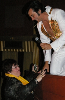 Kings Court judge Wendy King photo by Diana Brock THE KING’S COURT IN COLLINGWOOD Nevin Grant sums up the weekend A SUPER WEEKEND It was one hot July weekend with clear blue skies and brilliant sunshine. Fortunately Collingwood’s perpetual off-shore breezes helped everyone cope with the warmth. Town retailers were really into the spirit of “Elvis” with creative window displays and special prices. A record number of Elvis Tribute Artists performed at a number of venues in and around Collingwood. A record number of Elvis fans attended all of the festival events. This was “Collingwood 2007” and the competition was never stronger as an influx of top-notch ETAs competed not only for the Collingwood honours but for a chance to be the overall Pro, Non-Pro total points winner and grab that precious entry into ‘The Ultimate Elvis” competition in Memphis during “Elvis week”. Several ETAs raised the performance bar a notch or two and we witnessed some career highs in scores and entertainment. Probably the single most dynamic performance on the weekend was that of Jay Zanier in the Pro Concert Finals, saluted by a full-house standing ovation in the Eddie Bush Memorial Arena. Jay will be representing Collingwood in Memphis . At the Collingwood Gospel competition veteran ETA Anthony Von was the overall winner… completing the cycle for him: Anthony has now won Collingwood as a Non-Pro… Pro and now in the Gospel. Everyone worked hard to make Collingwood 2007 work. Rosemarie and her cast of volunteers did another magnificent job. The judges judged for a record 25 hours, evaluating more than 130 ETAs … some of them several times. The concessionaires, the carnies, the restaurateurs, and the organizers of Saturday’s “Elvis Parade”… everyone played their part to the hilt. This was the THIRTEENTH annual Collingwood Elvisfest. Obviously, in Collingwood, THIRTEEN is a “LUCKY” number!